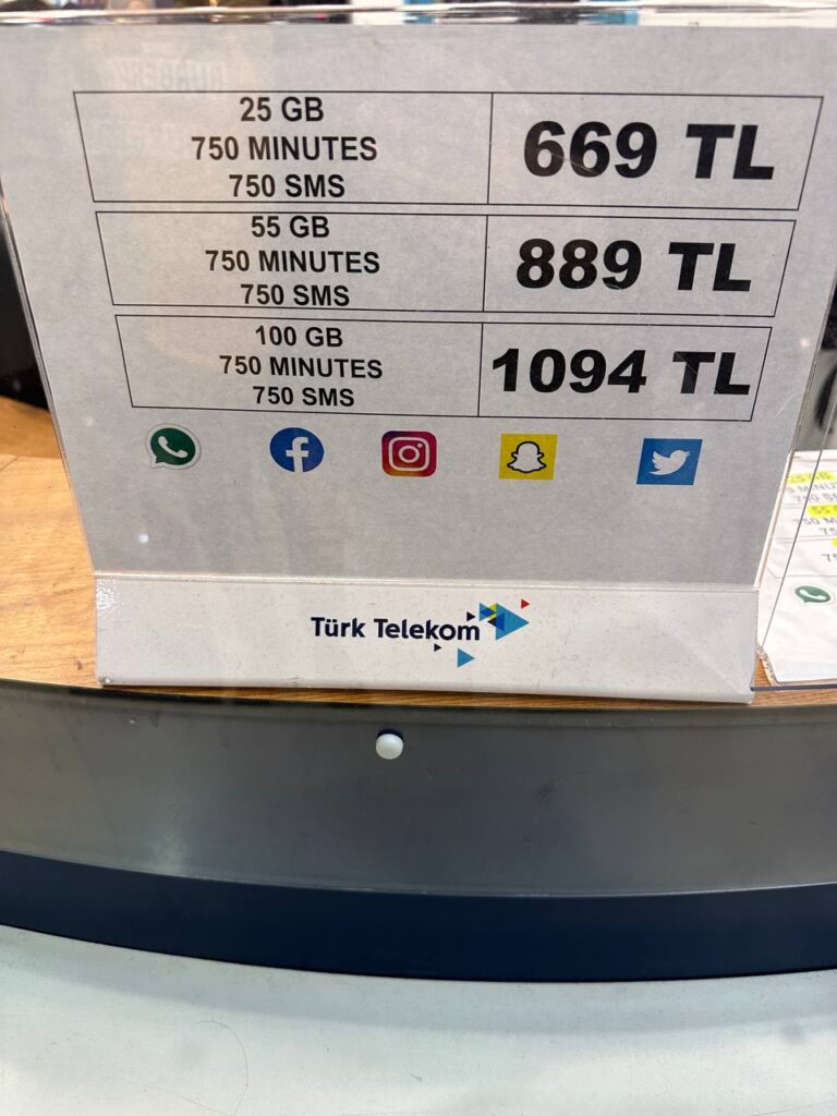 تصویر بالا قیمت سیمکارت ترک تلکام کشور ترکیه در غرفهی فرودگاه استانبول هست, که با توجه به بستهای که روی سیمکارت فعال هست بین 669 لیر تا 1000 لیر قیمت داره که با توجه به قیمت لیر در اسفند ۱۴۰۱ که اینعکس گرفته شده شما بین 2100 تا 3500 تومن باید برای یک سیمکارت محلی در ترکیه هزینه کنید که تازه بعد از ۲ ماه هم غیر فعال بشه (بقیهی اپراتورهای ترک هم به همین صورت هستند)